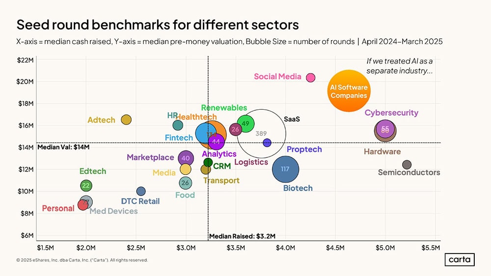 It might be surprising then to see that SaaS is not, in fact, dying. It’s experiencing robust growth in 2025, and Gartner reports that global SaaS spending is projected to reach approximately $300 billion this year. Seed and Series A valuations are currently high, but a lot of this is down, again, to AI. Data from Carta shows that valuations have been higher for AI SaaS companies since 2022. AI integration, vertical solutions, and enterprise adoption are the name of the game now.